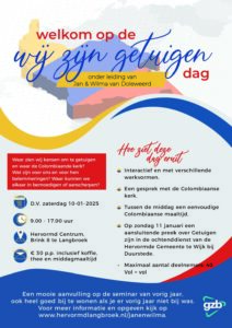 Tijdens het verlof van Jan & Wilma organiseren we weer een leerzame dag over het thema ‘Wij zijn getuigen’. Waar zien wij kansen om te getuigen en waar de Colombiaande kerk? Wat zijn voor ons en voor hen belemmeringen? Waar kunnen we elkaar in bemoedigen of aanscherpen? Een mooie aanvulling op de seminar van vorige jaar, maar ook heel goed bij te wonen als je er vorig jaar niet bij was. Van harte welkom!